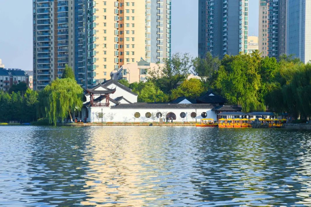 据说莫愁湖周边的房价也是南京市区的高地。湖边柳树垂条,廊桥水榭的古典风与远处的城市风貌也相映成趣。